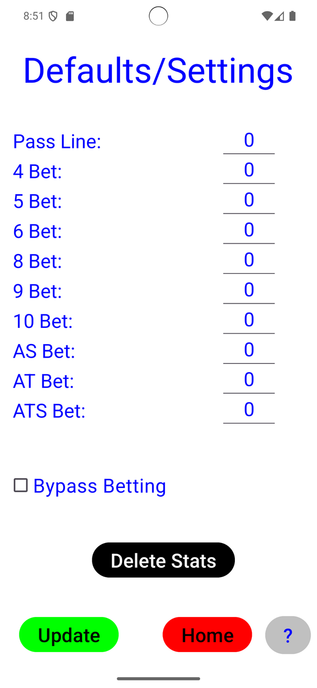 Defaults/Settings page is where you can set default bets for the Pass Line, 4 through 10, the All Small, All Tall, and the All Tall Small.You can also select the option to Bypass Betting which simply lets you record rolls.You also have the option to Delete Stats which will Remove All your data, current and lifetime. An "Are you Sure" popup will appear just to make sure you want to do this.