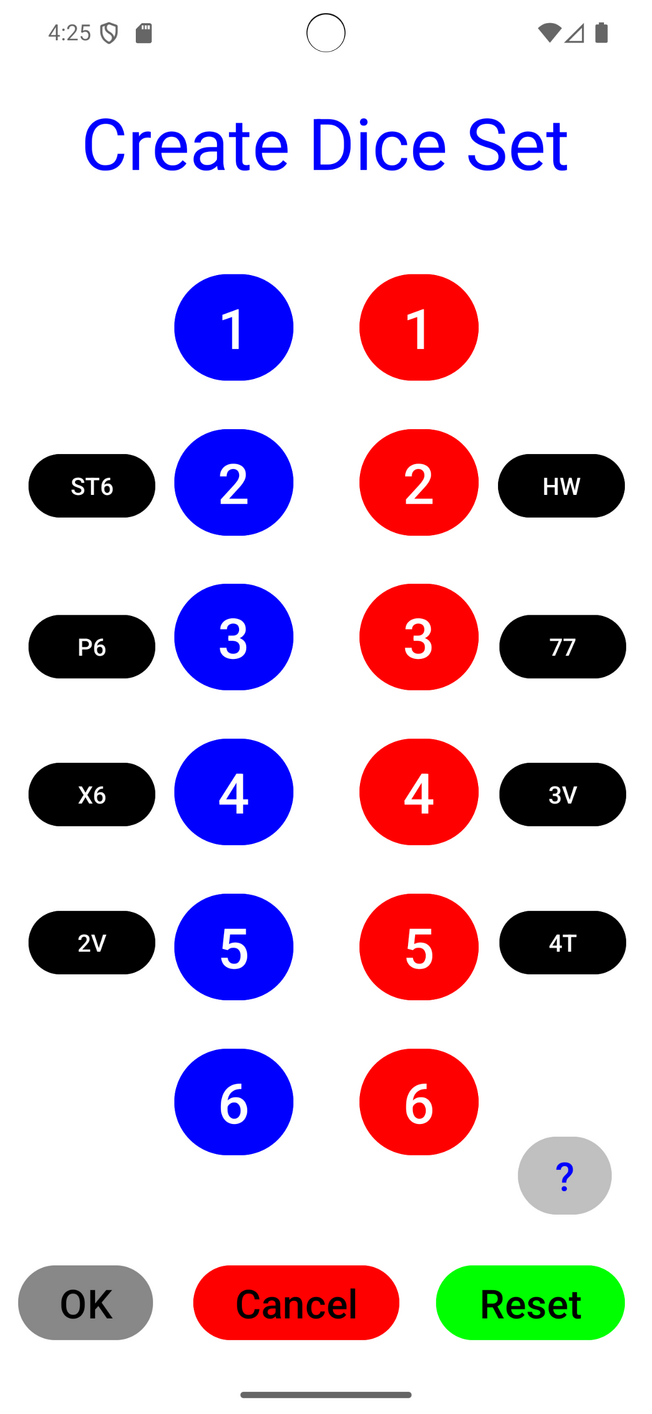 There are two columns of numbers down the center of the screen. Blue represents the left die and red represents the right die.To select your custom dice set, press the number that you would like on top. When you press the number, the background will turn green and the die number will change to a 'T'. You will notice that when you select your top number, the opposite number on the die will become grayed out. This is because it is not a possible choice for the front. For example, it you chose the six (6) as the top, the number six (6) would change to a 'T' and the number 1 would gray out as it is not a possible option for the front.After selecting the top, select from the remaining numbers the one you want facing you. Once selecting it, the color will turn green and the number will change to an 'F'.Repeat this process for the other column.There are eight (8) black buttons, 4 on each side of the screen. These buttons represent 8 preset dice sets: Straight 6, Parallel 6, Cross 6, 2V, Hardway, All 7's, 3V, and the 4/10.If at any time you want to start over, press the Reset button and start over.After you have selected a top and front for both dice, the OK button will become active. Press the button and it will return you to the Record Rolls screen.