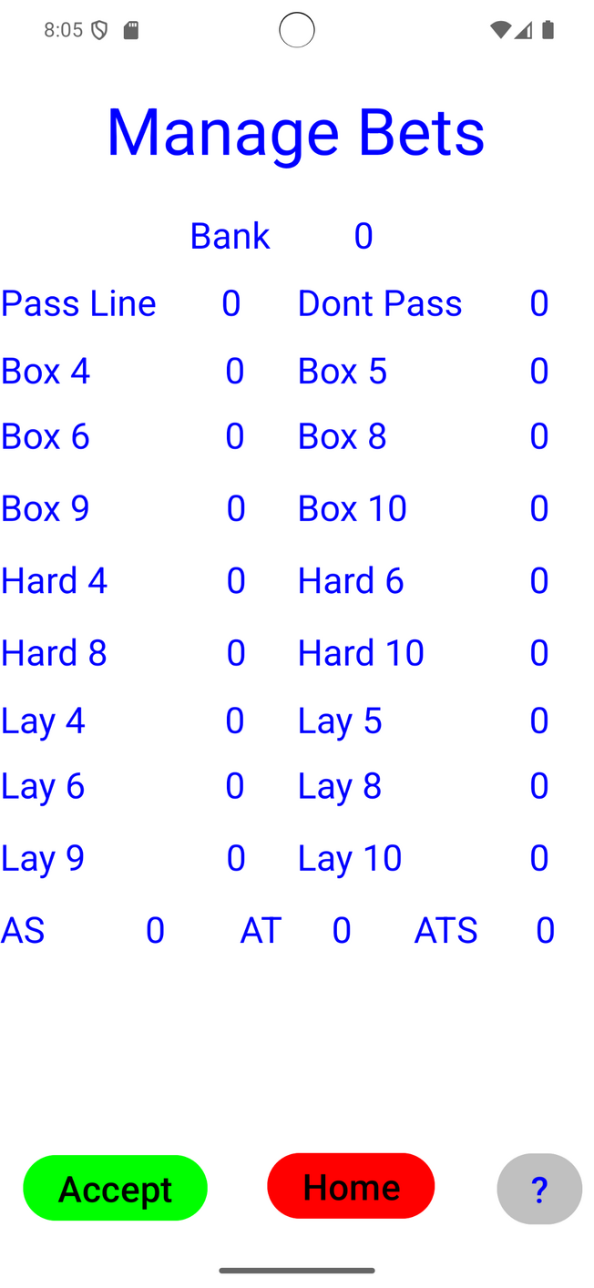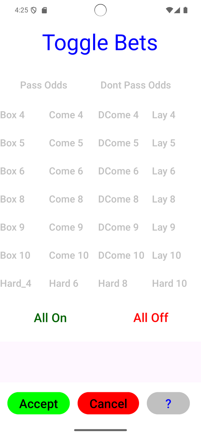 If a bet is not active, that is, has no money on it, it will display gray and cannot be changed.If a specific bet is on, it will be green. If it is off, it will be red.Clicking on the bet will toggle the state between on and off.The All On button will change all active bets on and set the color to green.The All Off button will change all active bets off and set the color to green.Hitting the Accept button will save your choices and return you to the Record Rolls screen.Hitting the Cancel button will not save any of your changes and return you to the Record Rolls screen.