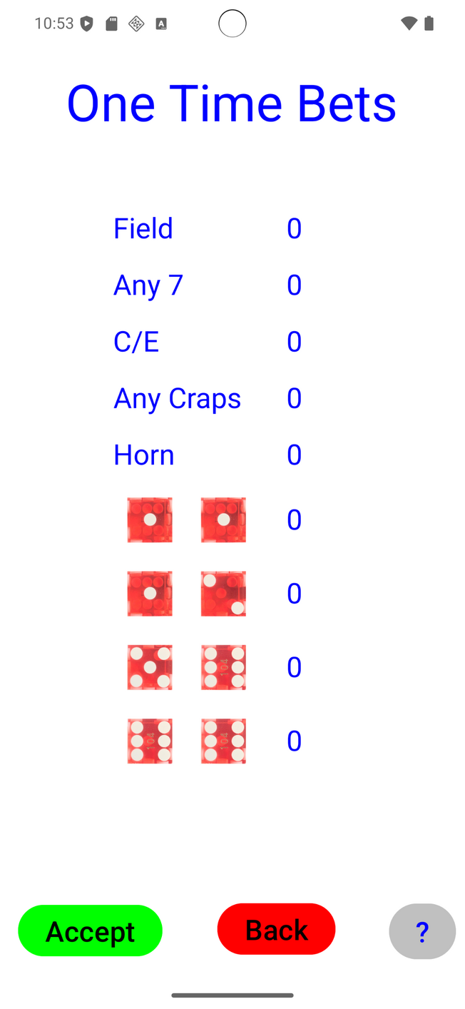 On the top left side of the screen you will see 'AS' with the numbers 2-6 under it. This represents the ALL Small and the numbers will turn green to show your progress towards completion. The same holds true for 'AT' on the top right hand side representing the All Tall.The Dice Set button on the left hand side of the screen are used to select which dice set you are using. It is very important to pick one as we need to know the starting point for each die in order to correctly analyze your roll. Pressing this button will pop up the Create Dice Set Screen.The One Time Bet button, also on the left hand side of the screen, will bring up a new screen where you can select any of the one time bets, Field, Any Craps, etc.The On/Off button, also on the left hand side of the screen, will open a new screen where you can turn certain bets on or off.There are two columns down the center of the screen with buttons 1 through 6; you simply tap the appropriate button for each die rolled then press the Accept button. As you press each number, the color will change to indicate your selection. After selecting one number from each column, the Accept button will become active and turn green so you can record this roll.Pressing the black C button allows you to place a Come bet, represented by the red C4 - C10. Once the Come bet is established, the appropriate C will turn green to indicate the bet was set.Pressing the black DC allows you to place a Don't Come bet, represented by the red DC4 - DC10. Once the Don't Come bet is established, the appropriate DC will turn green to indicate the bet was set.This screen also displays your Point when applicable, your Bank balance, your Money on the Table, and your current Roll #.There are various popup windows that can appear depending on what you roll.
