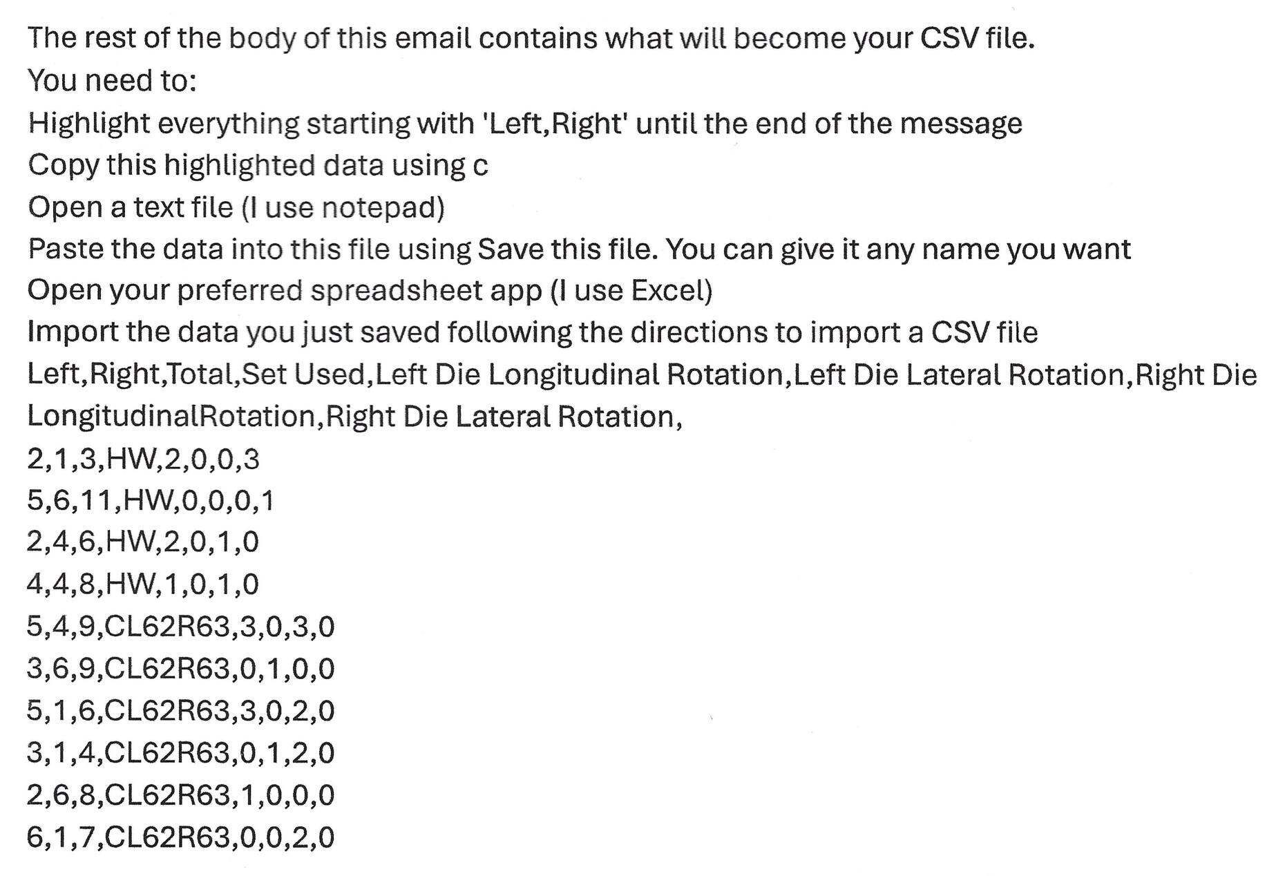 Just follow the directions IN the email to import the remaining contents into your preferred spreadsheet software.