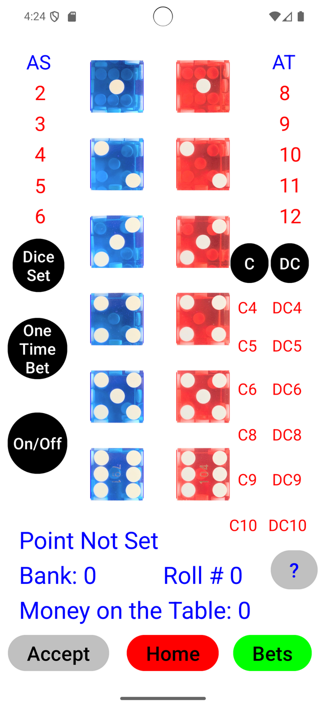 On the top left side of the screen you will see 'AS' with the numbers 2-6 under it. This represents the ALL Small and the numbers will turn green to show your progress towards completion. The same holds true for 'AT' on the top right hand side representing the All Tall.The Dice Set button on the left hand side of the screen are used to select which dice set you are using. It is very important to pick one as we need to know the starting point for each die in order to correctly analyze your roll. Pressing this button will pop up the Create Dice Set Screen.The One Time Bet button, also on the left hand side of the screen, will bring up a new screen where you can select any of the one time bets, Field, Any Craps, etc.The On/Off button, also on the left hand side of the screen, will open a new screen where you can turn certain bets on or off.There are two columns down the center of the screen with buttons 1 through 6; you simply tap the appropriate button for each die rolled then press the Accept button. As you press each number, the color will change to indicate your selection. After selecting one number from each column, the Accept button will become active and turn green so you can record this roll.Pressing the black C button allows you to place a Come bet, represented by the red C4 - C10. Once the Come bet is established, the appropriate C will turn green to indicate the bet was set.Pressing the black DC allows you to place a Don't Come bet, represented by the red DC4 - DC10. Once the Don't Come bet is established, the appropriate DC will turn green to indicate the bet was set.This screen also displays your Point when applicable, your Bank balance, your Money on the Table, and your current Roll #.There are various popup windows that can appear depending on what you roll.